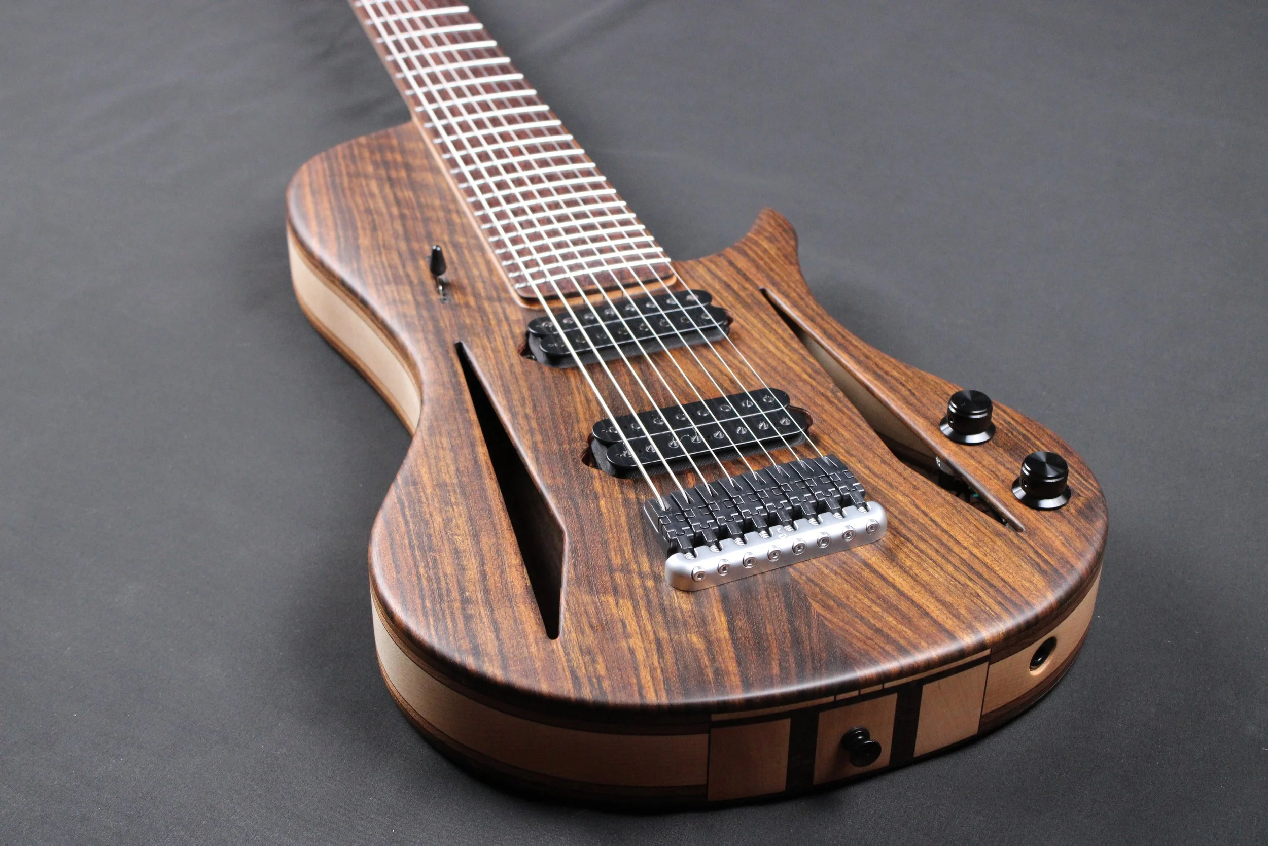 28 1/2” scale 8-string semi-hollow baritone guitar. Maple body and neck core with purpleheart and cherry accents. Ovangkol body and neck exterior. East Indian rosewood fretboard with stainless steel jumbo frets. Instrumental SFTY-3 bridge and Decomp neck humbucker set with individual coil taps via push/pull volume and tone pots. Pickup switching via 3-way blade switch. Hannes Schaller bridge, Hipshot locking open-gear tuners, and D’addario strap locks.