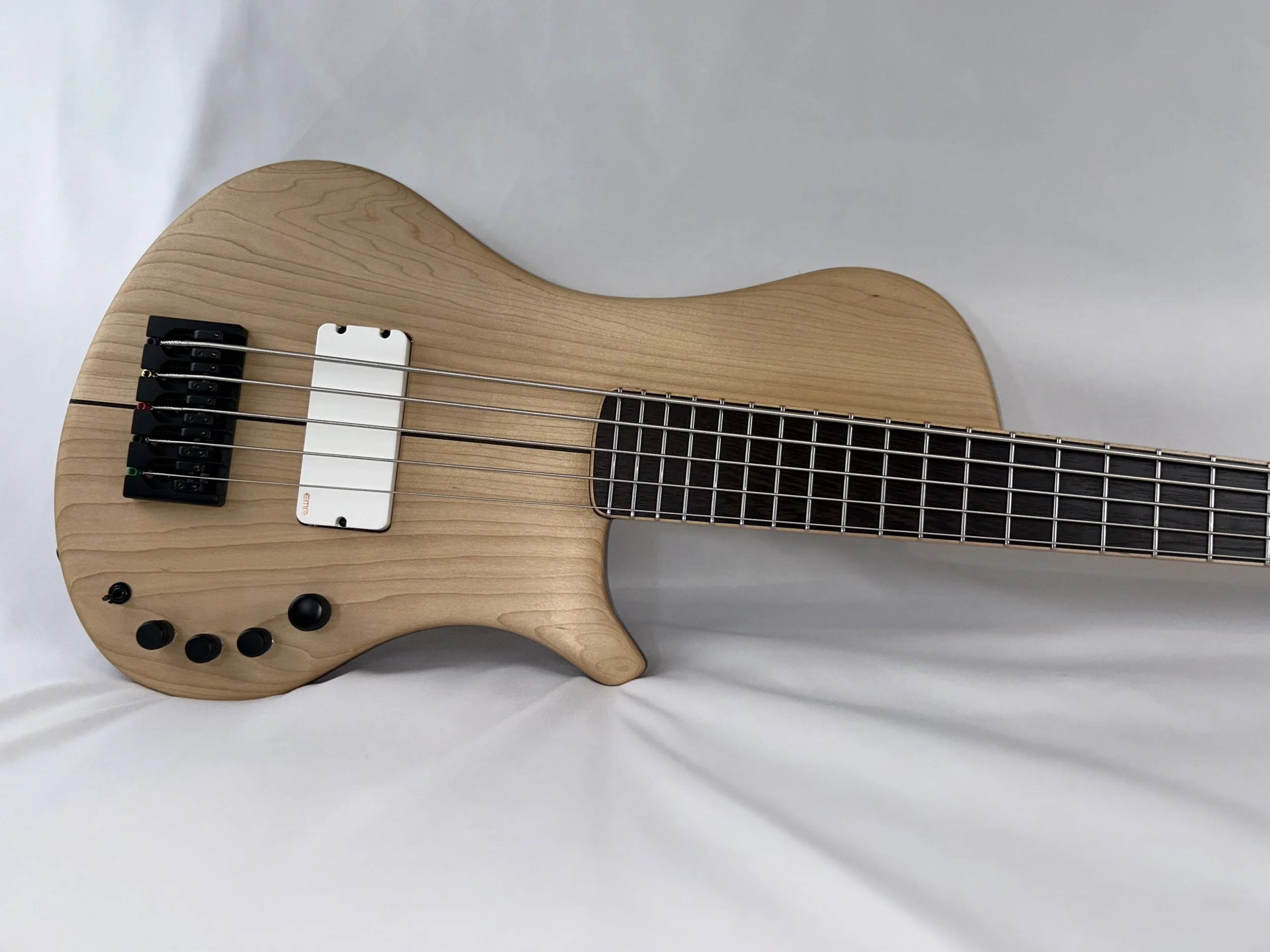 35” scale 5-string bass. Walnut body core with maple accents. Maple body and neck exterior. Wenge neck with padauk accents and wenge fretboard with stainless steel jumbo frets. EMG MM pickup with Darkglass Tone Capsule onboard preamp. Hipshot A bridge, Gotoh GB707 tuners, and D’addario strap locks.
